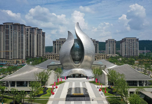 中間高起猶如破土而出的“種子”,被水波狀的“葉片”包裹著向天際延伸,合院環(huán)繞其四周,仿佛一幅建筑山水的絕妙圖景,點(diǎn)亮整個(gè)光谷。位于武漢東湖高新區(qū)的中國(guó)建筑科技館,在藍(lán)天白云映襯下格外搶眼。暑期,這里成為青少年觀眾游覽、研學(xué)的最佳選擇之一。