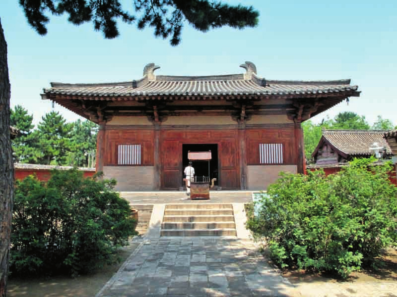 南禪寺大殿面闊、進(jìn)深各3間,平面近方形,單檐歇山灰色筒板瓦頂。大殿屋頂舉折極為平緩,在我國現(xiàn)存宋、金以前的建筑中,是最為平緩的一座。