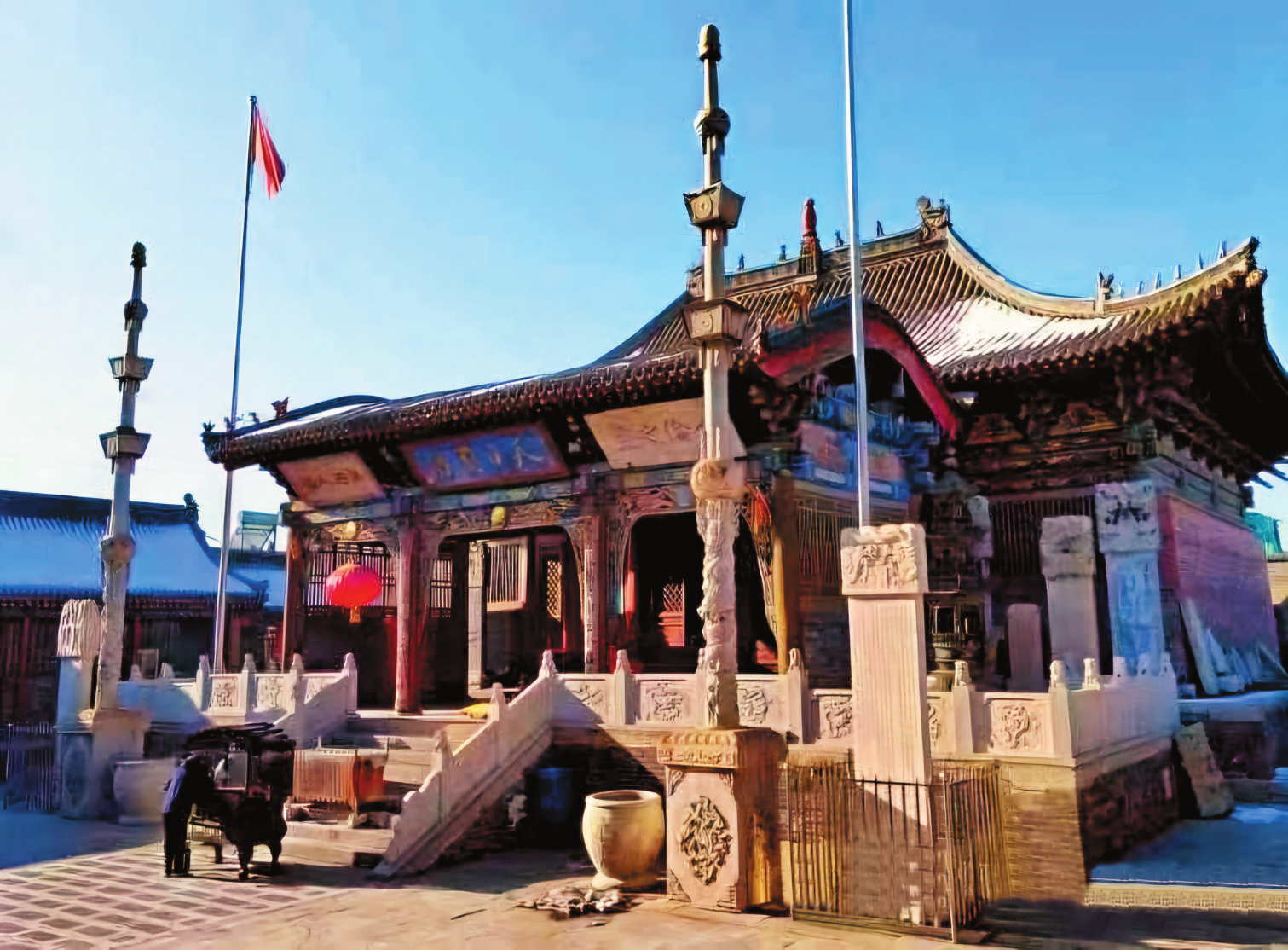 武廟內(nèi)的主要建筑是按照帝王殿宇的規(guī)制和風(fēng)格建造,以關(guān)帝殿為例,屋頂采用的是單檐廡殿頂,構(gòu)架為七檁前后廊式,前后檐柱頭科為五踩單翹單昂,前檐明次間施四扇六抹格扇門。廟內(nèi)楹聯(lián)所題文字均鑲銅材,各殿塑像也多為銅制,這與代縣歷史上盛產(chǎn)銅且擅長(zhǎng)制作銅器有很大關(guān)系。