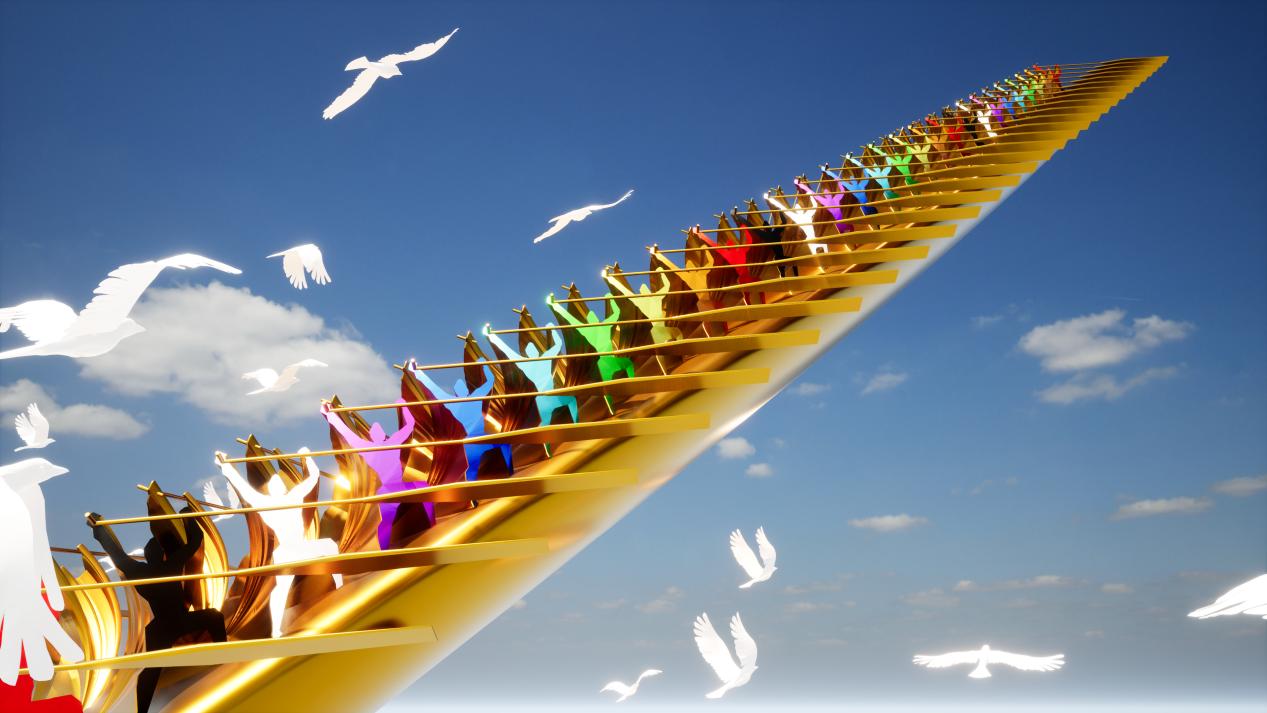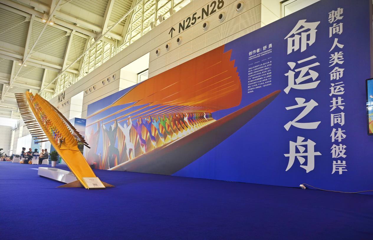 《命運之舟》雕塑作品以巨輪、龍舟、方舟、飛船的象征意義與形態(tài),概括提煉為國際化新圖騰雕塑,舟上迎著藍天劃向未來的72位奮力劃槳者,不分國度、不分種族、不分膚色,這是世界人民風雨同舟、命運共同的象征。其宏偉的規(guī)模、深刻的寓意和精湛的藝術(shù)手法,成為本次文旅博覽會的一大亮點。
