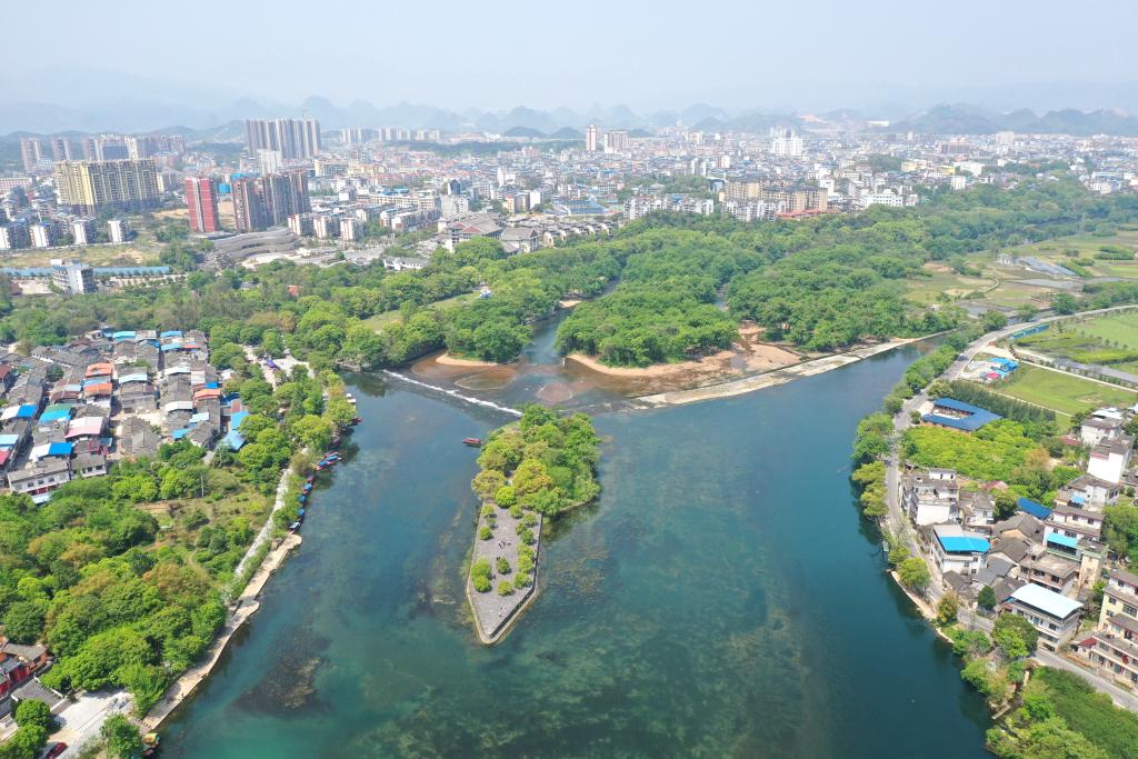 生態(tài)修復(fù)改造后的漓江伏龍洲景色(無人機(jī)照片)。新華社記者 周華 攝
