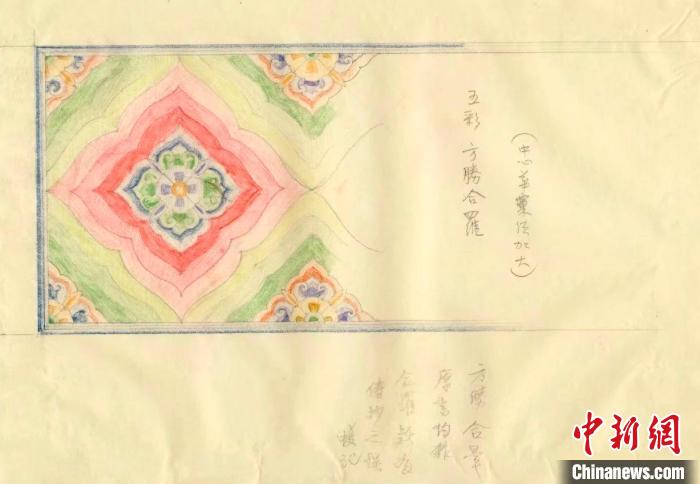 5月27日,“彩畫千年——中國官式彩畫傳承與創(chuàng)新展”在故宮博物院永壽宮展廳正式對公眾開放。圖為梁思成手繪的宋代五彩方勝合羅(復(fù)制品)。(故宮博物院供圖)