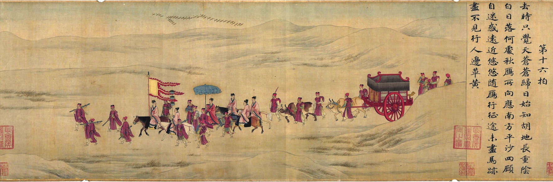 通過(guò)出土和存世的一些圖像,我們可以一窺漢代旄節(jié)之真容。洛陽(yáng)燒溝61號(hào)西漢壁畫(huà)墓中的壁畫(huà)磚上繪有一持節(jié)使者;山東嘉祥武氏祠一組畫(huà)像中,描繪了漢使持節(jié)拜見(jiàn)王陵之母的場(chǎng)景,手中所持之節(jié)正是旄三重,只是看起來(lái)柄長(zhǎng)不到八尺。至于“旄節(jié)之制”,漢代與先秦當(dāng)是有別的,將旄牛尾編成三重流蘇的制節(jié)之法始于漢,《事物紀(jì)原》載:“漢人有持節(jié),乃古旄也。然則節(jié)自周始,而旄節(jié)則起于漢也?!边@種持節(jié)使的形象,在南宋人所繪《胡笳十八拍》和《迎鑾圖》等表現(xiàn)外交題材的畫(huà)作中,仍有清晰體現(xiàn),可見(jiàn)這種持節(jié)出使的制度在古代一直延續(xù)。