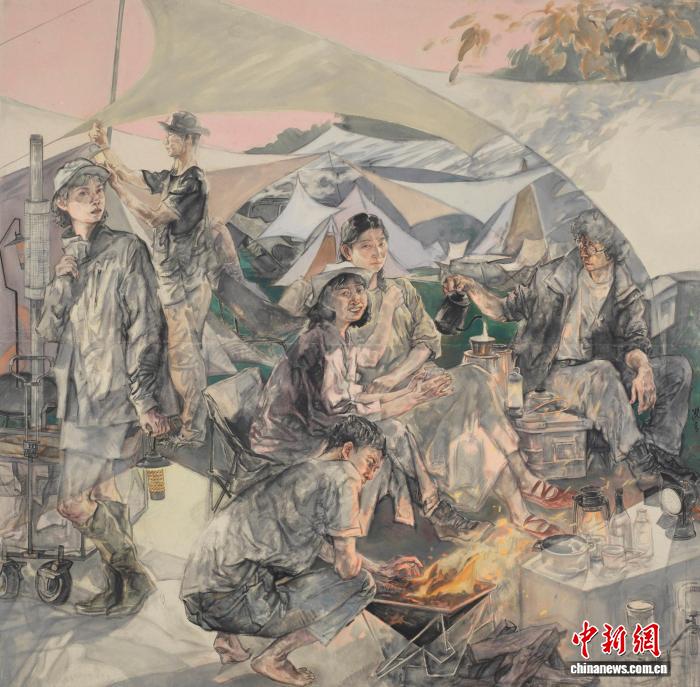 以畫家藺潔青的中國(guó)畫《清風(fēng)徐來》為例,其是浙江省第十五屆美術(shù)作品展金獎(jiǎng)作品,以傳統(tǒng)人物畫技法表現(xiàn)當(dāng)代青年郊野露營(yíng)場(chǎng)景,通過描繪清風(fēng)拂過林間被永恒定格的瞬間,傳遞都市人向往自然、追求心靈自由的當(dāng)代精神,展現(xiàn)出中國(guó)傳統(tǒng)繪畫語言在表現(xiàn)現(xiàn)實(shí)題材上的蓬勃生命力。