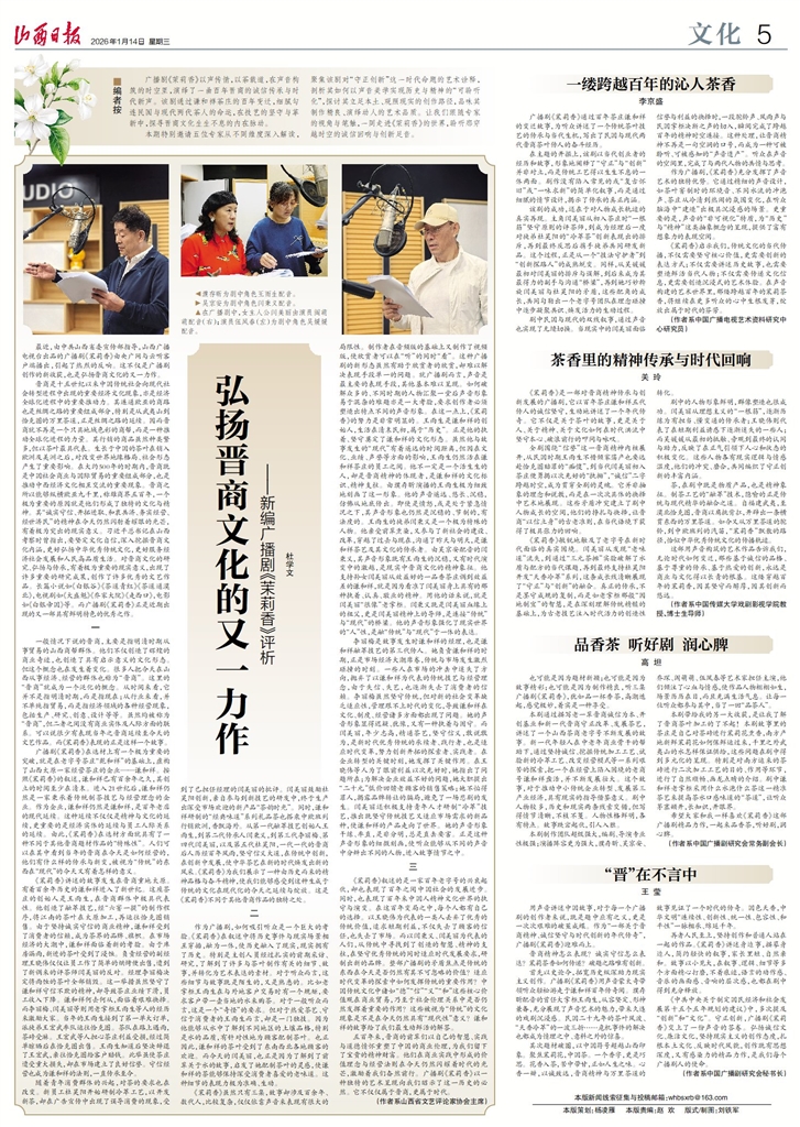 廣播劇《茉莉香》以聲傳情,以茶載道,在聲音構筑的時空里,演繹了一曲百年晉商的誠信傳承與時代新聲。該劇通過謙和祥茶莊的百年變遷,細膩勾連民國與現(xiàn)代兩代茶人的命運,在技藝的堅守與革新中,探尋晉商文化生生不息的內在脈動。