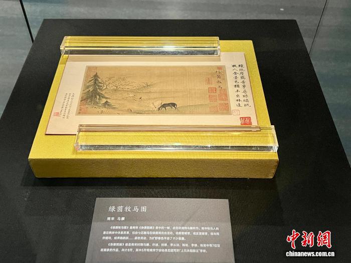 《綠茵牧馬圖》為國家一級文物,由南宋宮廷畫師馬麟所作。畫中牧馬人斜靠在桃林中休息賞景,任由七匹駿馬在綠茵間自由活動,或俯首啃草,或與同伴嬉戲,或奔跑跳躍……姿態(tài)靈動,為曠野春色平添了不少意趣。杜芝明表示,為最大限度地保護文物,該展品僅面向公眾展出一個月。