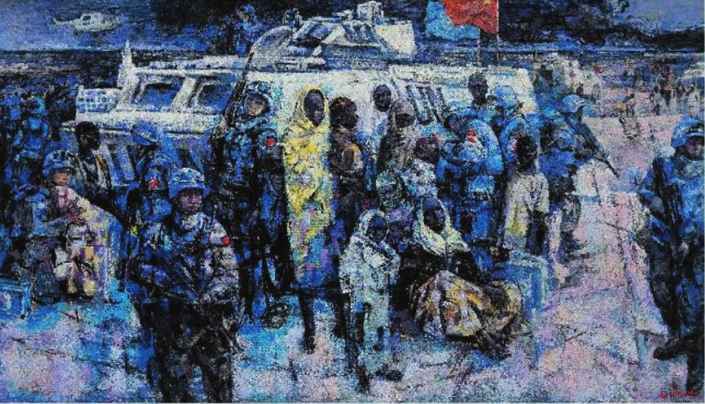 在續(xù)鶴賢眾多的作品中,從畫面表現(xiàn)效果方面,我是比較喜歡《和平使命——藍色交響曲》這幅作品的。無論畫面構(gòu)圖、色彩關(guān)系,還是人物造型以及表現(xiàn)技巧,都堪稱完美。畫面中無論人物形象、動態(tài)、表情,還是人與自然背景,都處在一種和諧美好的關(guān)系中,從一個新的角度給予美好詮釋。這幅作品表現(xiàn)的是我們的維和部隊“子弟兵”以自己的生命守護著世界和平,講述著構(gòu)建人類命運共同體的大國情懷。 (邢晨聲 文)