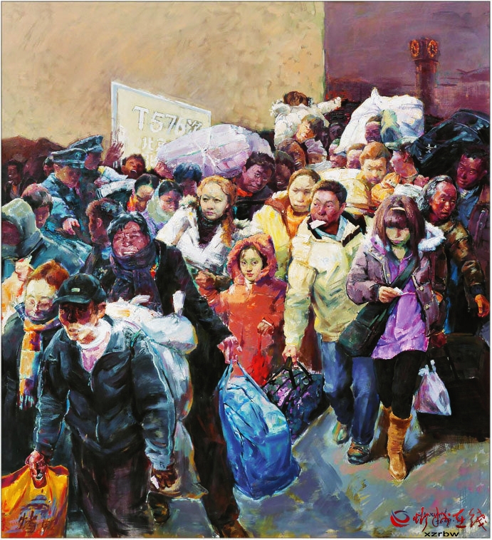 《春潮——回家過年》這幅作品是典型、真實的社會現(xiàn)實和人性本真的寫照,這個瞬間定格了一段讓多少人刻骨銘心的記憶,敘述了周期性的人類大遷徙——春運。該畫所蘊涵的是中國人心中那份最飽滿的希望。旅客是彼此都不認識的陌生人,為了一個回家的目的,毫無距離地擠在一起,人物個性鮮明。畫家具有強大的創(chuàng)作能力和藝術(shù)表現(xiàn)力。(邢晨聲 文)