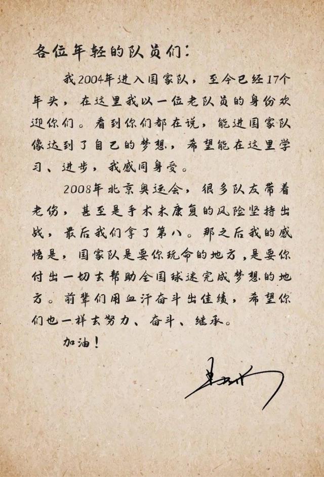 易建聯(lián)在信中回顧了自己首次入選國家隊的感受,表示自己完全能理解新隊員此刻的心情,他尤其強調(diào)了榮譽感與責(zé)任感,對這些小兄弟們說“國家隊是要你玩命的地方”,“各位年輕隊員們,我2004年進(jìn)入國家隊,至今已經(jīng)有17個年頭,在這里我以一位老隊員的身份歡迎你們??吹侥銈兌荚谡f,能進(jìn)國家隊像達(dá)到了自己的夢想,希望能在這里學(xué)習(xí)、進(jìn)步,我感同身受。2008年北京奧運會,很多隊友帶著老傷,甚至是手術(shù)未康復(fù)的風(fēng)險堅持出戰(zhàn),最后我們拿到了第八。那之后我的感悟是,國家隊是要你玩命的地方,是要你付出一切去幫助全國球迷完成夢想的地方。前輩們用血汗奮斗出佳績,希望你們也一樣去努力、奮斗、繼承?!?/span>