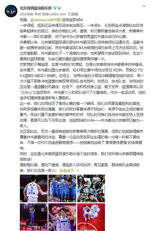 林書豪個(gè)人社交平臺(tái)視頻截圖 人民網(wǎng)北京9月15日電(楊喬棟)15日,林書豪通過(guò)個(gè)人社交平臺(tái)發(fā)布自制視頻宣布,下個(gè)賽季將不再代表北京首鋼男籃征戰(zhàn)CBA賽場(chǎng),而將繼續(xù)尋求征戰(zhàn)美國(guó)職業(yè)籃球聯(lián)賽的機(jī)會(huì)。林書豪在視頻中稱,最近四周都在思考下一步的規(guī)劃,但是最終還是忍痛做了一個(gè)艱難的決定——暫時(shí)告別CBA,“我決定今年(下個(gè)賽季)不回首鋼去打球,這個(gè)決定是我人生最難的一個(gè)決定?!彪S后,北京首鋼男籃通過(guò)官方微博發(fā)布長(zhǎng)文,在確認(rèn)林書豪“離開”的同時(shí)也第一時(shí)間為其送上祝福。北京男籃官宣全文如下: 一年很短,短到還沒(méi)來(lái)得及回味就說(shuō)再見(jiàn);一年很長(zhǎng),長(zhǎng)到那些點(diǎn)滴相處如珍珠般串起綿長(zhǎng)的回憶,烙在你我的心間。遺憾,卻仍要鄭重地告訴大家,新賽季林書豪——我們的豪哥,將不會(huì)作為北京首鋼男籃的外援出戰(zhàn)CBA比賽。 休賽期以來(lái),北京首鋼籃球俱樂(lè)部與林書豪及團(tuán)隊(duì)保持良好的溝通交流,誠(chéng)邀書豪一起攜手繼續(xù)征戰(zhàn),并在書豪返回CBA為前提的續(xù)約合同上雙方達(dá)成共識(shí)。經(jīng)過(guò)反復(fù)斟酌,林書豪做出了一個(gè)艱難的決定:他希望再次嘗試回到NBA,在這個(gè)最高的籃球殿堂,為自己最執(zhí)著的籃球理想再拼搏一次。 對(duì)夢(mèng)想的不懈追逐,這是“林瘋狂”的源起,也是北京首鋼與林書豪牽手的關(guān)鍵點(diǎn)。去年夏天,林書豪加盟北京首鋼,在43場(chǎng)比賽中場(chǎng)均出場(chǎng)32.9分鐘,貢獻(xiàn)22.7分5.6籃板5.6助攻1.9搶斷。在場(chǎng)上,他用出色的大局觀冷靜理智地組織進(jìn)攻,用一次次奮不顧身沖擊籃筐的表現(xiàn)帶領(lǐng)球隊(duì)走向勝利;在場(chǎng)邊,他與隊(duì)友、與球迷的互動(dòng)是一道溫馨的風(fēng)景線;在場(chǎng)下,他積極投身公益,敢于發(fā)聲,疫情期間以及“三分心”公益項(xiàng)目中,林書豪個(gè)人和團(tuán)隊(duì)進(jìn)行了大量捐款。作為一名運(yùn)動(dòng)員,他的追求和精神是值得所有人尊敬的。 這一年,我們共同經(jīng)歷了每場(chǎng)比賽的每一個(gè)瞬間,我們共同享受著勝利的喜悅,共同承擔(dān)著失敗的落寞,我們共同分享著來(lái)源于球迷們,來(lái)源于彼此之間的愛(ài)與勇氣。球迷們毫不吝嗇所有的掌聲和歡呼,球隊(duì)的兄弟們既與林書豪在場(chǎng)上互相支撐,更是可以私下共同出游、坦誠(chéng)相待的伙伴——林書豪與北京首鋼已融為一家人。 也正因如此,雙方一直保有能夠在新賽季再次攜手的愿景,但我們也能夠理解并尊重林書豪最終的決定,尊重一位運(yùn)動(dòng)員在職業(yè)生涯的每一分每一秒都不曾放棄,不惜一切代價(jià)地追逐最高理想——他完美地詮釋了“更高更快更強(qiáng)”的體育精神。 同時(shí),這也是北京首鋼籃球俱樂(lè)部永恒不變的信條,我們將懷揣北京首鋼精神繼續(xù)前進(jìn)! 愿前程似錦,愿功不唐捐,愿追夢(mèng)人終將收獲!再見(jiàn)豪哥,期待有機(jī)會(huì)再續(xù)前緣,我們永遠(yuǎn)是一家人!