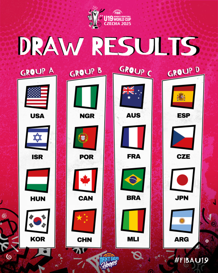一共有16支來自世界各地的U19隊(duì)伍將參加7月12日至20日在捷克布爾諾舉行的U19女籃世界杯,這16支球隊(duì)被分為四個(gè)小組。A組包括美國(guó)隊(duì)、以色列隊(duì)、匈牙利隊(duì)和韓國(guó)隊(duì),C組是澳大利亞隊(duì)、法國(guó)隊(duì)、巴西隊(duì)和馬里隊(duì),D組是西班牙隊(duì)、捷克隊(duì)、日本隊(duì)和阿根廷隊(duì)。