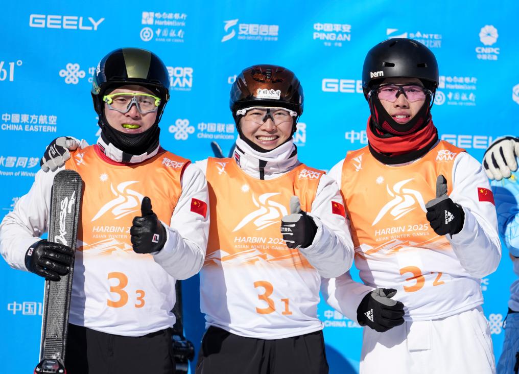 2月10日,齊廣璞、徐夢桃和李心鵬(從左至右)在賽后合影。當(dāng)日,在亞布力舉行的第九屆亞冬會自由式滑雪空中技巧混合團體決賽中,中國隊奪冠。新華社記者 賴向東 攝