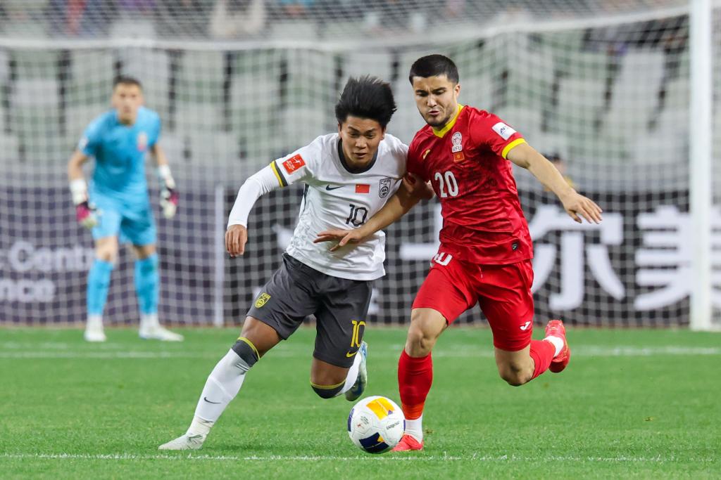 在2月15日進(jìn)行的2025亞足聯(lián)U20亞洲杯小組賽中國(guó)隊(duì)對(duì)陣吉爾吉斯斯坦隊(duì)比賽中,蒯紀(jì)聞(左)與對(duì)手拼搶。新華社記者梁旭攝