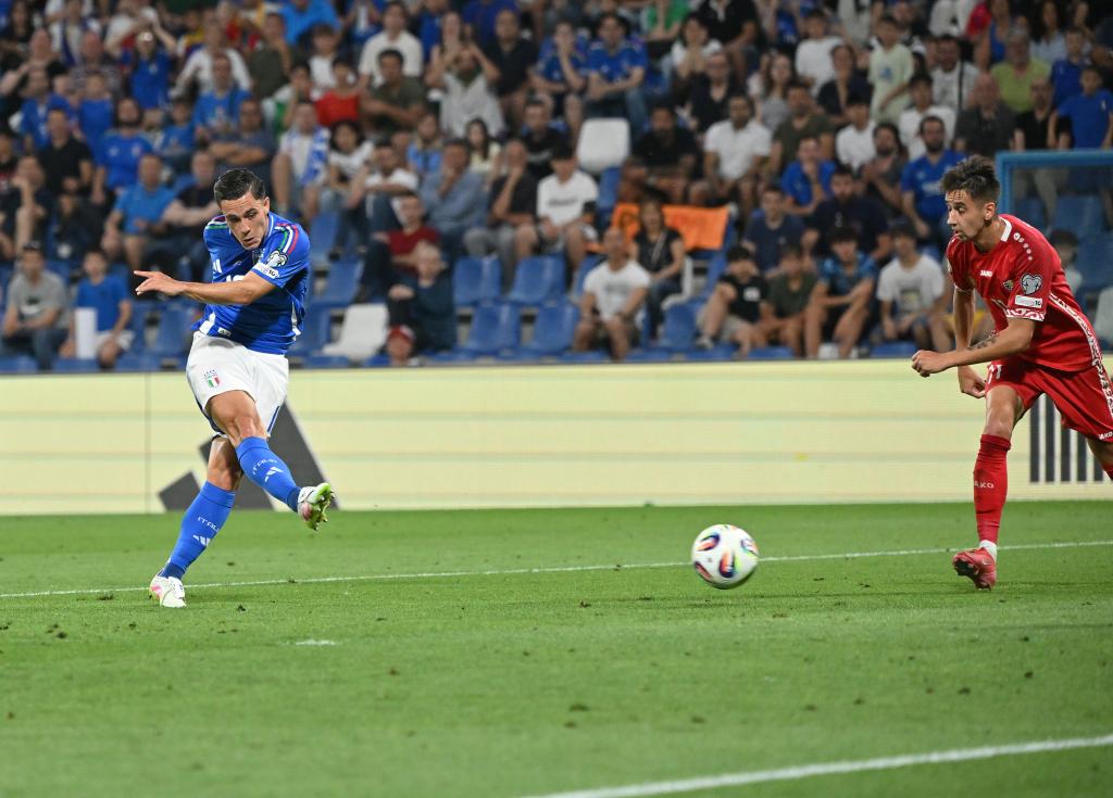 6月9日,意大利隊(duì)球員拉斯帕多里(左)在比賽中射門得分。新華社發(fā)(阿爾貝托·林格利亞攝)