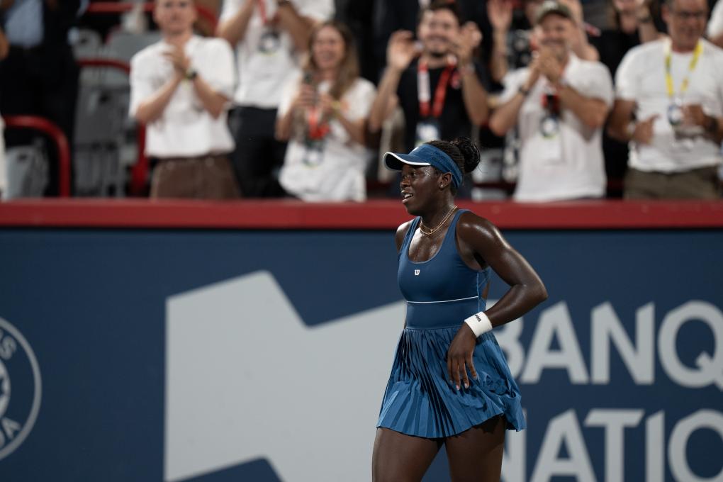 8月6日,張帥(右)和湯森德在比賽中互相鼓勁。新華社發(fā)(李海濤攝) 本場(chǎng)比賽兩對(duì)組合勢(shì)均力敵,兩盤(pán)過(guò)后打成平局,決勝盤(pán)一直打到13:11才決出勝負(fù)。雖然失利,但36歲的張帥打出了老將風(fēng)采,尤其是第二盤(pán),網(wǎng)前截?fù)舸虺霾簧俸们颉?/p> 女單半決賽的兩場(chǎng)比賽中,加拿大選手姆博科以2:1戰(zhàn)勝哈薩克斯坦名將萊巴金娜,日本選手大坂直美以2:0戰(zhàn)勝丹麥選手陶森。 本土作戰(zhàn)的姆博科在1:6先丟一盤(pán)的情況下,以7:5、7:6(4)連勝兩盤(pán)逆轉(zhuǎn)。決勝盤(pán)雙方戰(zhàn)況膠著,一路緊咬比分到“搶七局”,看得現(xiàn)場(chǎng)觀眾興奮不已。