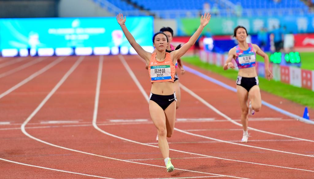 浙江隊選手陳妤頡(前)在第一屆全國青少年田徑運動會女子100米決賽沖線后慶祝。新華社記者 吳青昊 攝