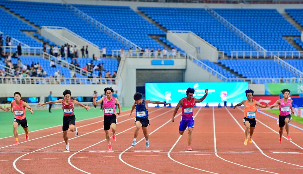 四川隊選手方俊程(中)在男子100米決賽中沖線。新華社記者 吳青昊 攝