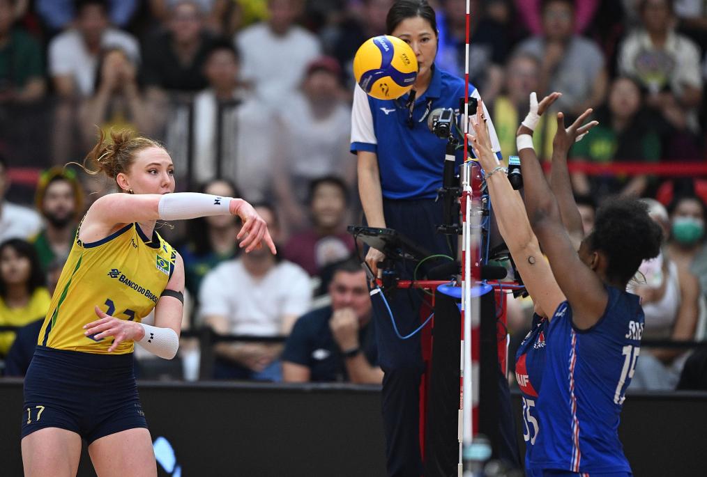 巴西隊在小組賽中曾以3:2險勝法國隊,這次她們以27:25、33:31和25:19勝出。前兩局的爭奪異常激烈,第二局更是一波三折。法國隊一度取得19:15的優(yōu)勢,卻被巴西隊連得4分追成19平。此后,巴西隊以24:22率先拿到局點,卻被法國隊連得3分以25:24反超。領(lǐng)先幾度易手、雙方又多次錯過局點之后,比分來到31平。關(guān)鍵時刻,庫迪耶斯扣球成功,接下來加比在反擊中推攻得分,幫助巴西隊以33:31險勝。