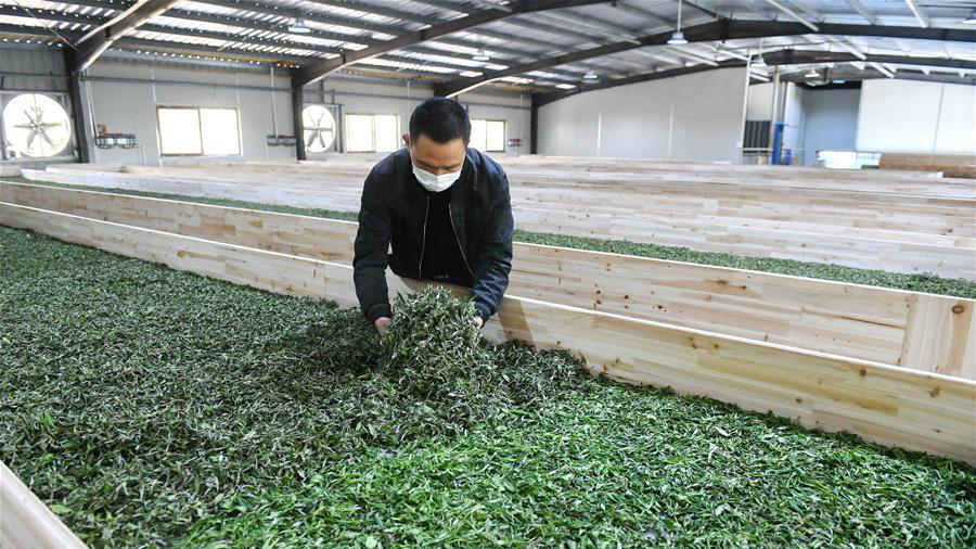 △下黨鄉(xiāng)村民在茶葉生產(chǎn)車(chē)間內(nèi)進(jìn)行壽寧白茶的曬青。