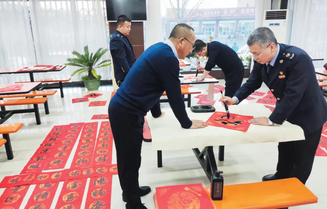 辦稅服務(wù)廳內(nèi),淡淡的墨香在空氣中飄散,辦稅群眾現(xiàn)場(chǎng)“點(diǎn)單”,書法愛好者筆走龍蛇、揮灑自如,楷、行、隸、草等多種書體各顯神韻,一幅幅喜氣盈盈的春聯(lián)和一個(gè)個(gè)形態(tài)各異的“?!弊郑瑸榫挥行虻霓k稅服務(wù)廳增添了濃濃的年味,也傳遞著稅務(wù)人與納稅人繳費(fèi)人之間的深厚情誼。稅務(wù)干部劉占春和賀文耀連著幾天奮戰(zhàn)在辦稅服務(wù)廳,“沒想到這點(diǎn)愛好還能在工作中派上用場(chǎng),看著辦稅群眾拿上對(duì)聯(lián)的笑容,心里也挺高興”。