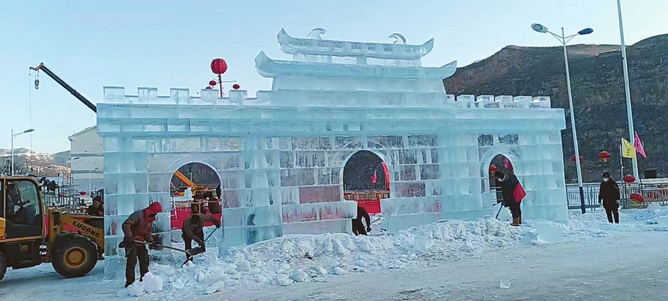 圖為偏關老牛灣景區(qū),冰雕師傅們正精心打磨冰雕作品。 本報記者攝