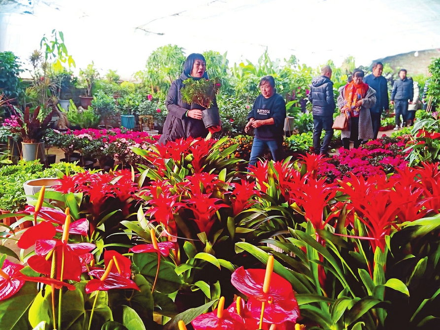 2月8日,原平市柳巷村花卉大棚里的鮮花爭奇斗艷,前來選花的人絡繹不絕,為來年圖個好彩頭,也為過年增添儀式感。(趙春曉 攝)