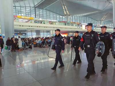 在太原南站,隨處可見民警堅(jiān)守一線守護(hù)平安的身影。本報(bào)記者郭寧攝