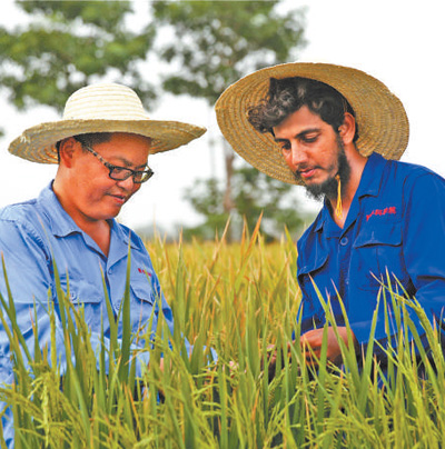 在巴基斯坦東部旁遮普省首府拉合爾西南郊,中國農(nóng)業(yè)專家(左)與育種站助理研究員瓦西姆·瓦希德在稻田里進行雜交水稻選種試驗。新華社記者 蔣 超攝