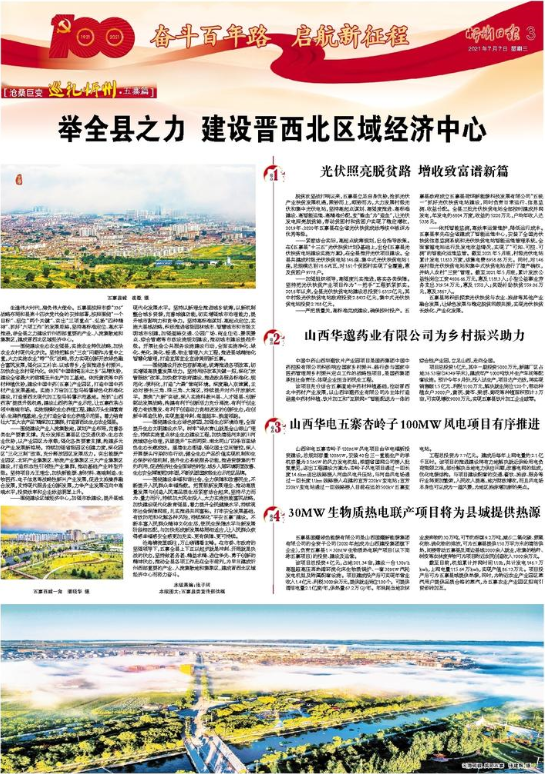 ——經(jīng)濟(jì)綜合實力顯著增強。昔日的五寨是一個老山區(qū)、窮地方。通過100年的努力,五寨經(jīng)濟(jì)總量快速增長,綜合實力大幅提升。特別是黨的十八大以來,五寨縣立足風(fēng)、光、農(nóng)業(yè)等優(yōu)勢,壯大核心企業(yè),延長產(chǎn)業(yè)鏈條,推動經(jīng)濟(jì)綜合實力顯著提升??傃b機容量78.6兆瓦的光伏電站、1×30兆瓦生物質(zhì)熱電聯(lián)產(chǎn)、總規(guī)模400兆瓦的風(fēng)力發(fā)電、晉西北天然氣、昌茂石油、金航運輸?shù)纫慌卮螽a(chǎn)業(yè)項目建成投產(chǎn);五寨現(xiàn)代農(nóng)業(yè)產(chǎn)業(yè)園區(qū)成功入選國家首批農(nóng)村產(chǎn)業(yè)融合發(fā)展示范園,示范帶動效應(yīng)日益顯現(xiàn);建成9座大型煤炭集運站,帶動發(fā)煤企業(yè)達(dá)90余戶,形成了具有地域特點的煤炭發(fā)運基地,既實現(xiàn)了煤炭產(chǎn)業(yè)“無中生有”,又有效帶動餐飲、住宿、汽修汽配、成品油經(jīng)營、餐飲服務(wù)等相關(guān)產(chǎn)業(yè)快速發(fā)展,使第三產(chǎn)業(yè)成為全縣經(jīng)濟(jì)的支柱產(chǎn)業(yè),推動縣域高質(zhì)量轉(zhuǎn)型發(fā)展邁出新步伐。2020年,全縣地區(qū)生產(chǎn)總值完成31.4億元,是1949年的786倍。