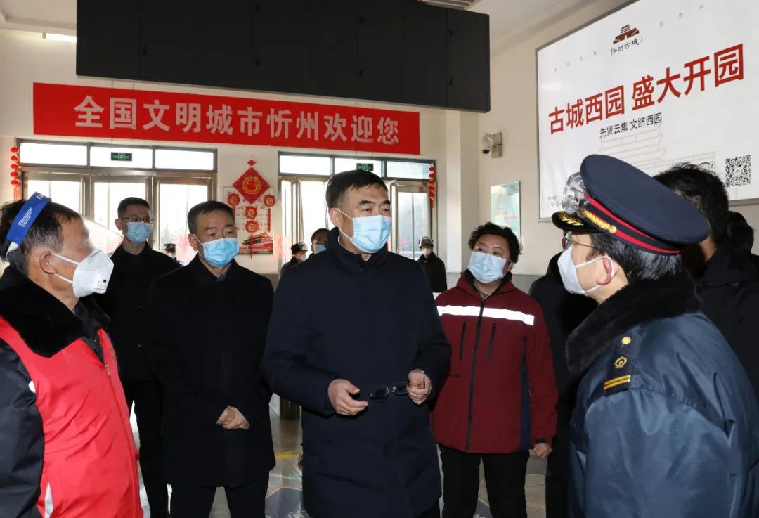 在忻州西站,李建國看望鐵路站場人員、衛(wèi)生防疫人員和社區(qū)志愿者,了解進(jìn)出站高鐵列車班次和人流高峰時間分布。他指出,防疫一線人員是疫情防控的“第一道防線”,要以崇高的職業(yè)使命感切實守好第一落點的防疫責(zé)任,不折不扣落實各項防控措施,嚴(yán)格排查篩查,有力、有序、有效做好站點疫情防控工作。要根據(jù)客流峰谷時段科學(xué)排班、合理調(diào)度、保證休息,要嚴(yán)格操作規(guī)程,做好個人防護(hù),為忻州筑牢衛(wèi)生安全屏障。