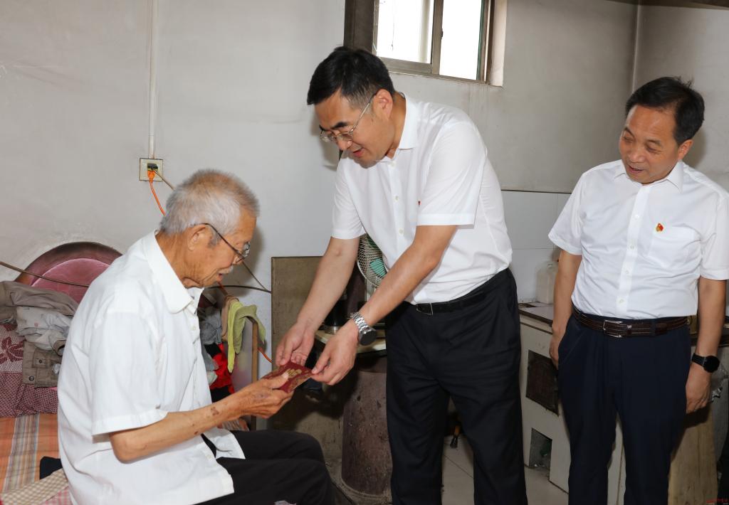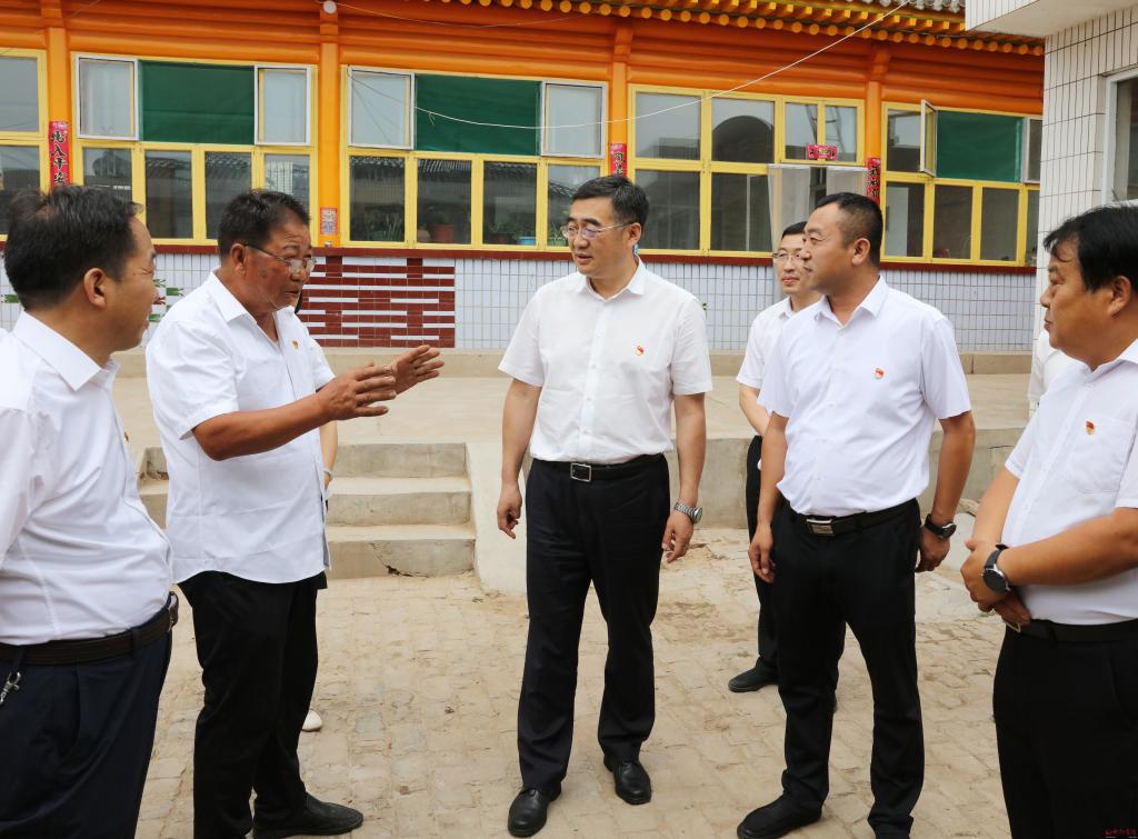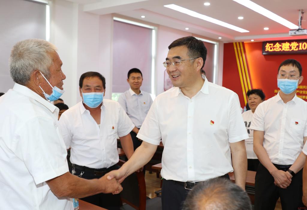 在弓家莊村。范濤 攝 6月30日,市委副書(shū)記、市長(zhǎng)李建國(guó)深入原平市王家莊鄉(xiāng)弓家莊村,走訪慰問(wèn)宋還順、宋艮貴等困難老黨員,調(diào)研了解鄉(xiāng)村治理情況和村民大棚蔬菜產(chǎn)業(yè)發(fā)展情況,圍繞“鄉(xiāng)村振興”為基層黨員干部講授專題黨課,慶祝建黨101周年。市政府秘書(shū)長(zhǎng)張艮生和市鄉(xiāng)村振興部門負(fù)責(zé)人等參加。