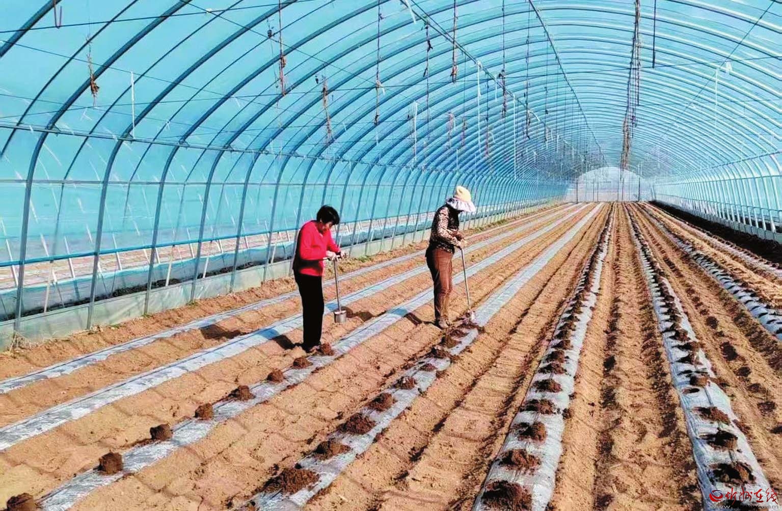 陽(yáng)春三月,春風(fēng)拂過(guò)雙乳山,西大王村的豆角產(chǎn)業(yè)園迎來(lái)豆角種植好時(shí)機(jī)。大棚里,六七個(gè)工人有序作業(yè),有的在點(diǎn)坑穴,有的在撒種、填土。一個(gè)大棚種好后,打開(kāi)閥門(mén),水流順著地上的滴管涌到坑穴,為剛?cè)鱿碌姆N子提供水分。據(jù)了解,西大王村采用“黨支部+集體經(jīng)濟(jì)合作社+農(nóng)戶”的發(fā)展模式,既為集體增收,又讓村民受益。今年,豆角種植園區(qū)一共有13個(gè)大棚,占地約40畝。為了搶抓農(nóng)時(shí),提前上市,賣個(gè)好價(jià)格,此次播種雇了許多村民幫忙,播種大約需要半個(gè)月時(shí)間才能完成。