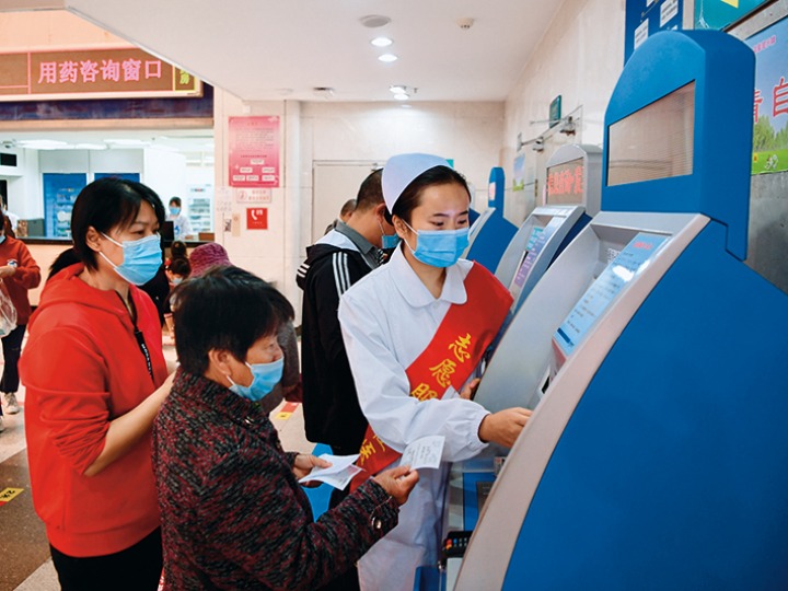 三明市第一醫(yī)院志愿者協(xié)助就醫(yī)者打印取藥單(2020年11月24日攝)。新華社記者姜克紅 攝