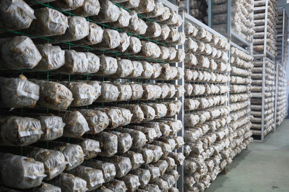 9月6日,德祥實業(yè)有限公司生產(chǎn)加工基地內(nèi),菌棒被培育在恒溫培養(yǎng)室。新華社記者 趙鑫虎 攝