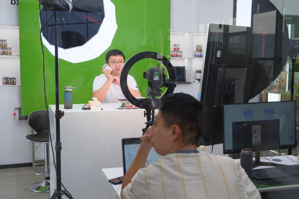 9月6日,銷售人員正在德祥實業(yè)有限公司內(nèi)進(jìn)行電商直播。新華社記者 趙鑫虎 攝