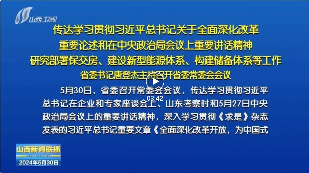 山西日?qǐng)?bào)報(bào)道 5月30日,省委召開(kāi)常委會(huì)會(huì)議,傳達(dá)學(xué)習(xí)貫徹習(xí)近平總書(shū)記在企業(yè)和專(zhuān)家座談會(huì)上、山東考察時(shí)和5月27日中央政治局會(huì)議上的重要講話精神,深入學(xué)習(xí)貫徹《求是》雜志發(fā)表的習(xí)近平總書(shū)記重要文章《全面深化改革開(kāi)放,為中國(guó)式現(xiàn)代化持續(xù)注入強(qiáng)勁動(dòng)力》,傳達(dá)貫徹全國(guó)切實(shí)做好保交房工作視頻會(huì)議精神,審議通過(guò)《山西省加快規(guī)劃建設(shè)新型能源體系的實(shí)施意見(jiàn)》《關(guān)于構(gòu)建山西省儲(chǔ)備體系的行動(dòng)方案》。省委書(shū)記唐登杰主持會(huì)議。