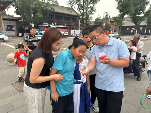 活動(dòng)現(xiàn)場(chǎng),在一個(gè)特殊的攤位上,由近到遠(yuǎn)分別擺放著“冰毒”“海洛因”“搖頭丸”等各種眼花繚亂的毒品仿真模型?!皝韥韥?,走過路過不要錯(cuò)過!”“瞧一瞧,看一看!”禁毒社工在“攤位”前賣力吆喝著,一陣陣吆喝聲引來了眾多游客,游戲通過套圈的方式,組織游客套中現(xiàn)場(chǎng)的毒品模型并準(zhǔn)確說出毒品名稱即可獲得扇子、手機(jī)支架、帆布包等獎(jiǎng)勵(lì)。