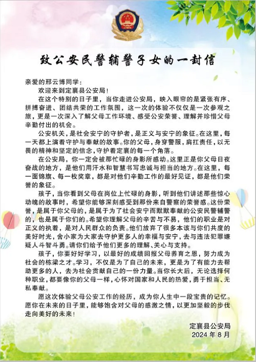 為進(jìn)一步增強(qiáng)中小學(xué)生反詐、禁毒、交通安全意識(shí),通過小手拉大手等形式,大力學(xué)習(xí)、宣傳、弘揚(yáng)武霖同志英勇無畏、忠誠為民的高尚品質(zhì)。8月20日上午,定襄縣公安局精心策劃,組織開展了“警娃探警營”主題警營體驗(yàn)日活動(dòng),50余名民輔警子女和警爸警媽共同走進(jìn)警營,體驗(yàn)警察生活、感受警營文化。