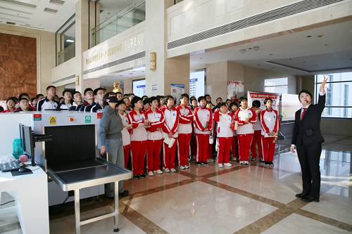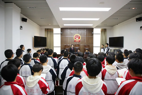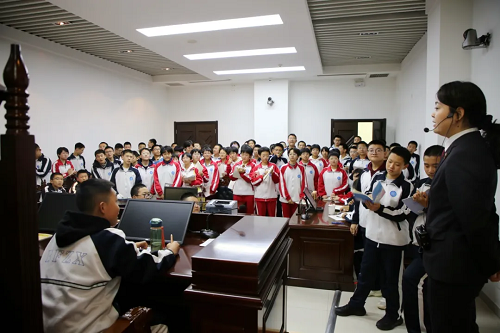 “同學(xué)們,這邊是我們的安檢通道,進(jìn)入法院的人員需要在這里接受安全檢查,所有違禁物品是不能進(jìn)入法院的?!痹诜ㄔ褐v解員的帶領(lǐng)下,同學(xué)們先后參觀了訴訟服務(wù)中心、陽光大廳、審判法庭、法治宣傳教育室、院史陳列室等場(chǎng)所,認(rèn)真觀看了中院全面建設(shè)專題片和中院干警自編自導(dǎo)自演的預(yù)防未成年人犯罪題材法治微電影《你依然是天使》,全面了解了法院的職能作用、機(jī)構(gòu)設(shè)置、辦案流程和歷史文化等情況。