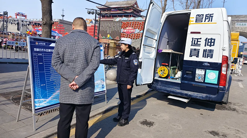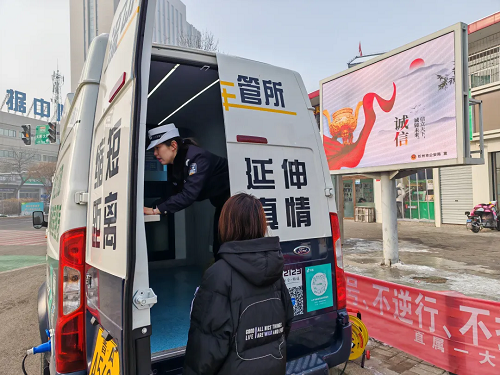 春節(jié)假期,城市、鄉(xiāng)村到處都彌漫著歡樂祥和的氣氛,初一至初七,在山西省忻州市忻府區(qū)光明西街古城北廣場(chǎng)、公園西街世紀(jì)花苑小區(qū)南門等人流量大、人員集中場(chǎng)所,忻州市公安局交警支隊(duì)的警郵車管便民服務(wù)車格外顯眼。“縮短距離、延伸真情”,這輛承載著為駕駛?cè)颂峁崆橹艿椒?wù)、為車輛安全出行提供保障,被群眾稱為“流動(dòng)車管所”的車管便民服務(wù)車讓寒冬暖流涌動(dòng)。
