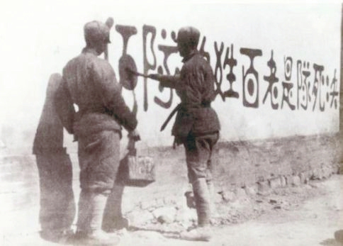 圖2 山西新軍既是戰(zhàn)斗隊,又是工作隊。他們走到哪里,宣傳到哪里,動員青年參軍;組織人民武裝自衛(wèi)隊、游擊隊;協(xié)助地方建黨、建政,組建工、農(nóng)、青、婦等群眾團體,創(chuàng)建抗日根據(jù)地。圖為1938年初,決死隊戰(zhàn)士在沁縣書寫宣傳標語。