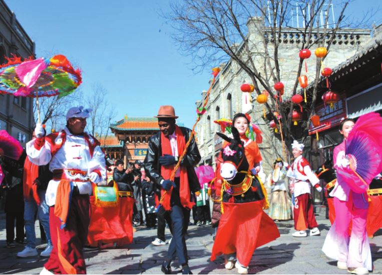 外國友人參與“跑驢”特色民俗表演活動。